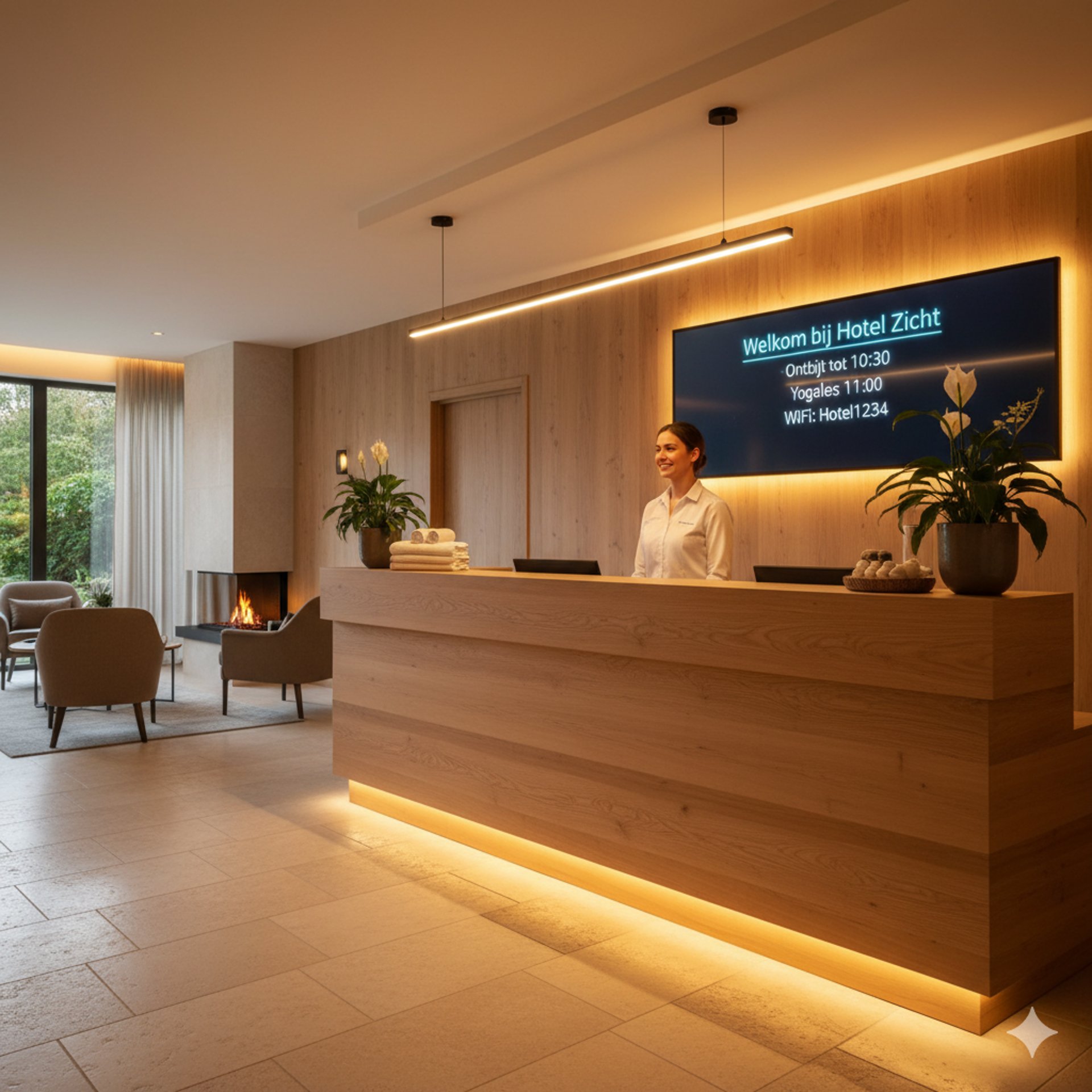 Toon je gerechten, arrangementen of praktische informatie op een scherm, dan neemt dat direct vragen weg aan de balie of bar. Gasten hoeven niet meer te zoeken of telkens iets te vragen. En je team hoeft het niet continu uit te leggen.