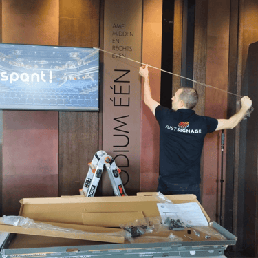 – Elk scherm kreeg een eigen JustSignage-player voor stabiele aansturing en overzichtelijk beheer.